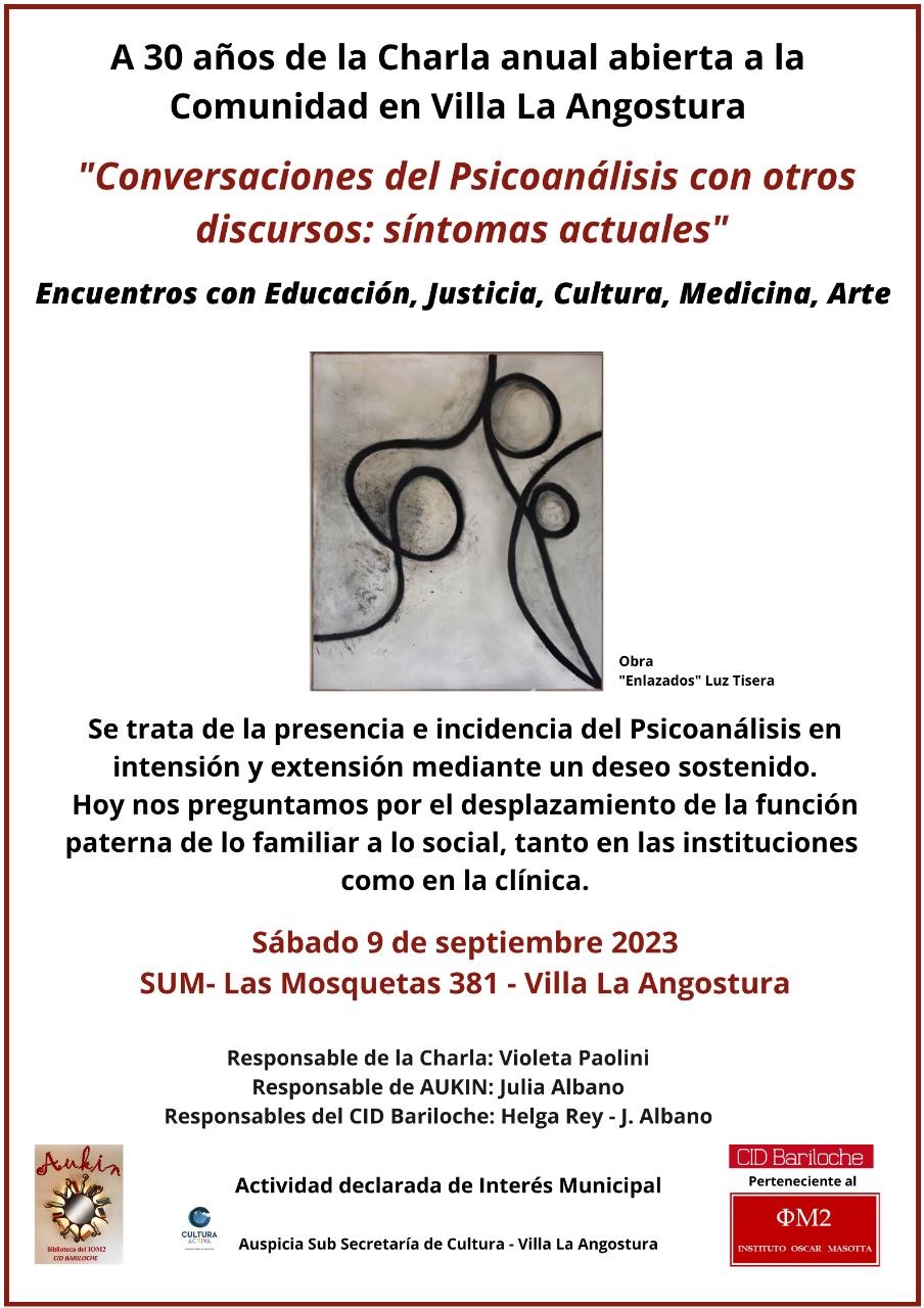 Una de las maneras de comenzar a difundir y transmitir el Psicoanálisis en Villa La Angostura fue a través de las Charlas donde se abrió la conversación de la práctica analítica con otros oficios, tomando en cuenta los síntomas de la época. Muchas temáticas nos han convocado.